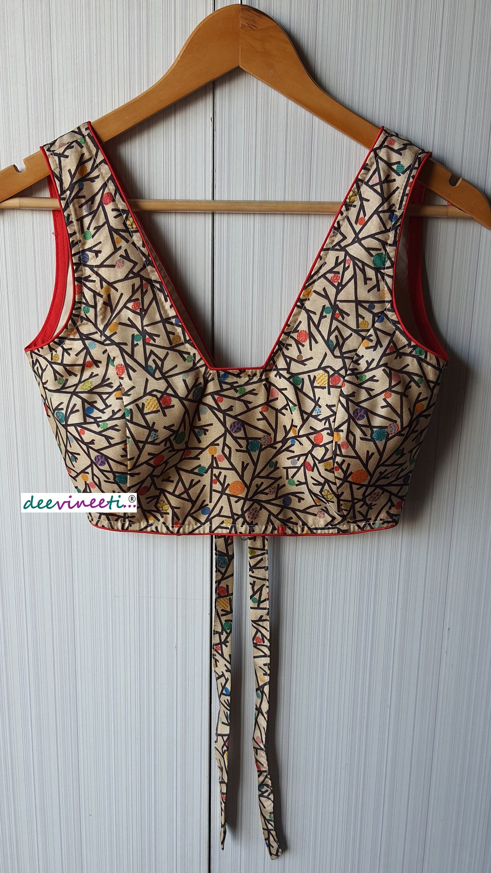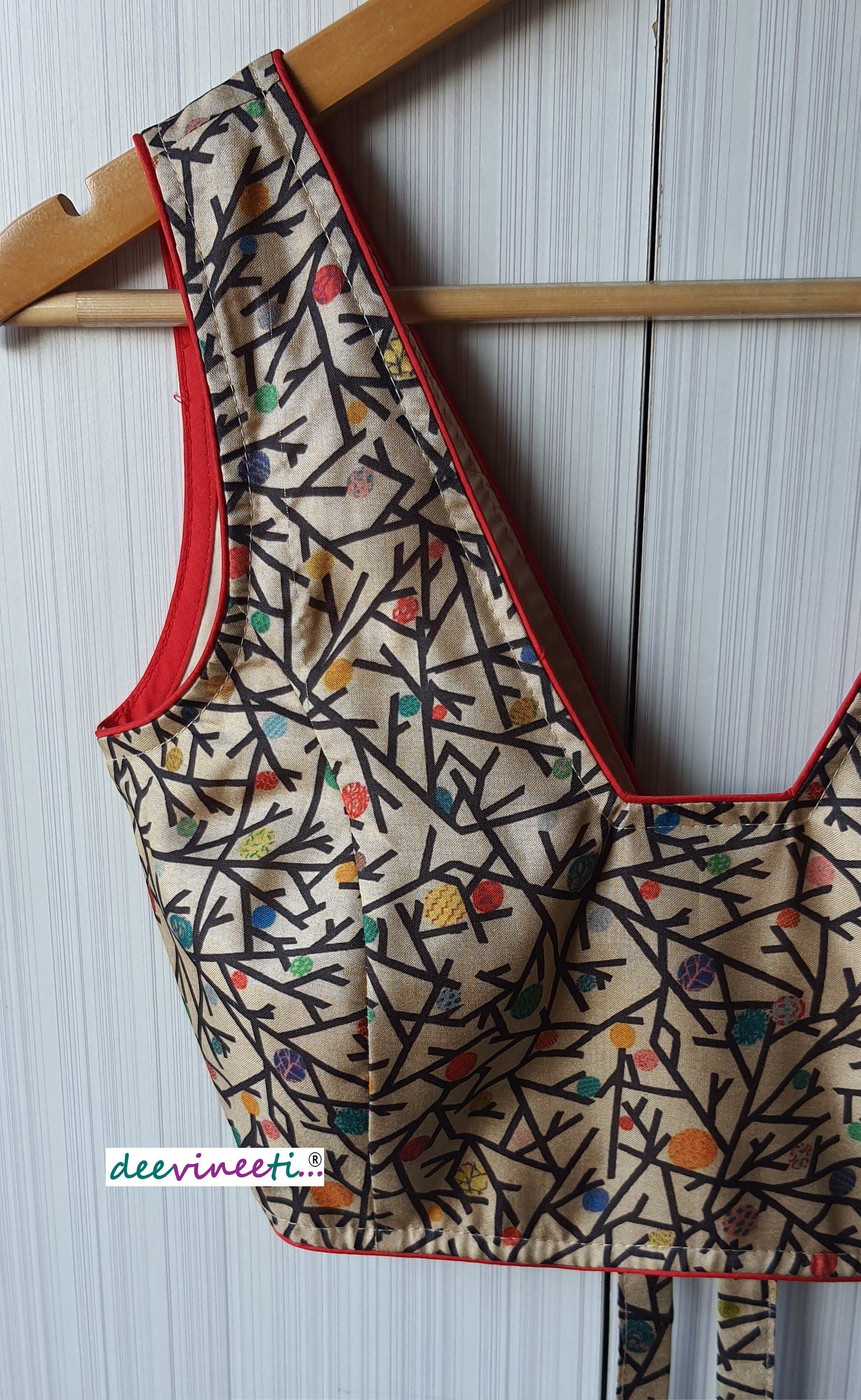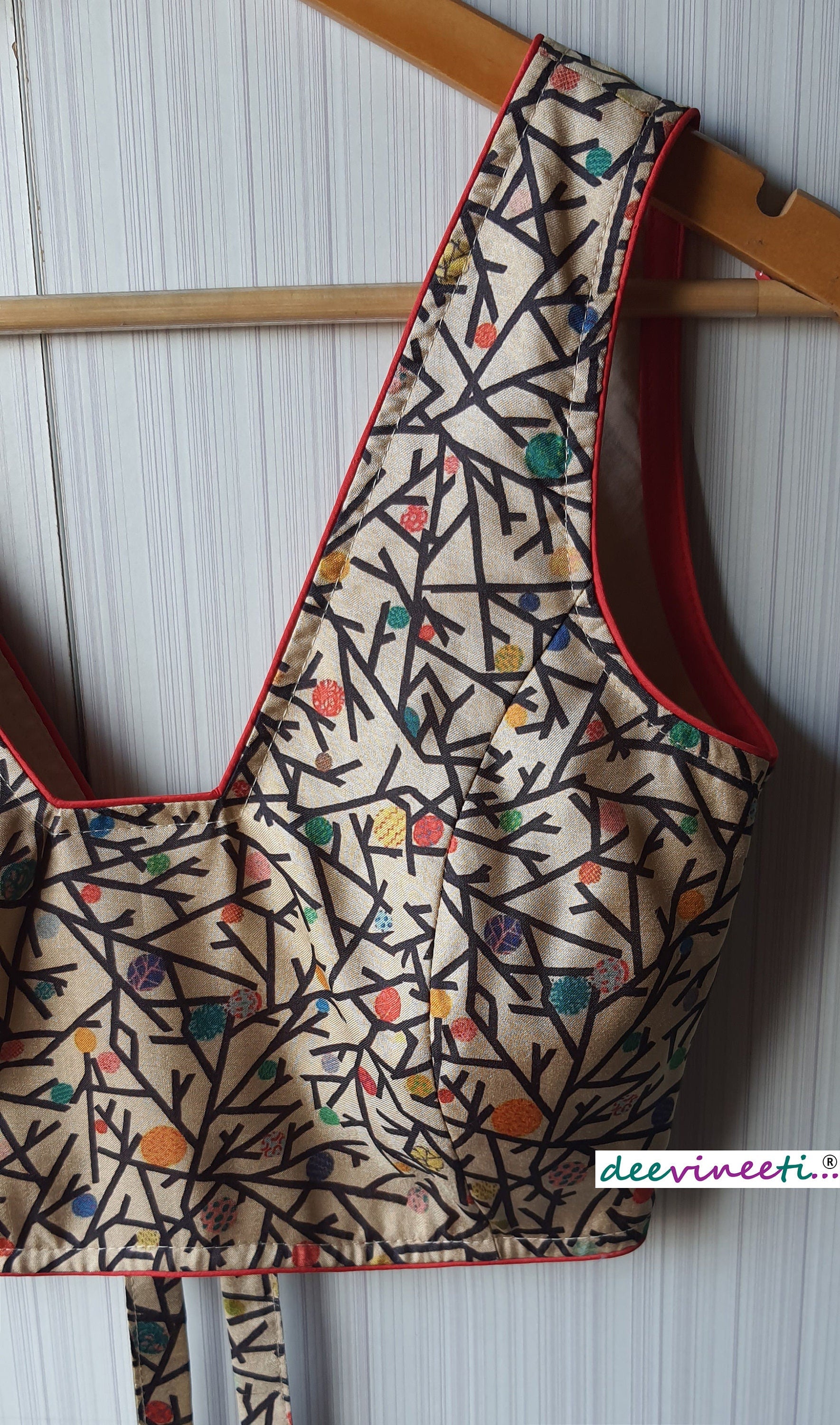 Beige Printed Khadi Silk Blouse Trapeze Neck Blouse DVBL_069