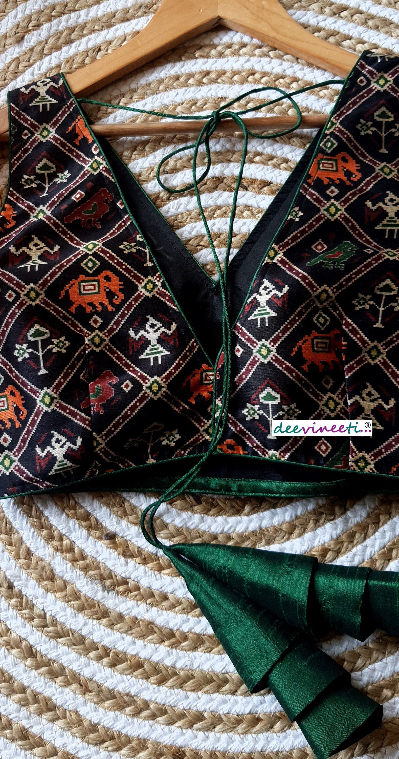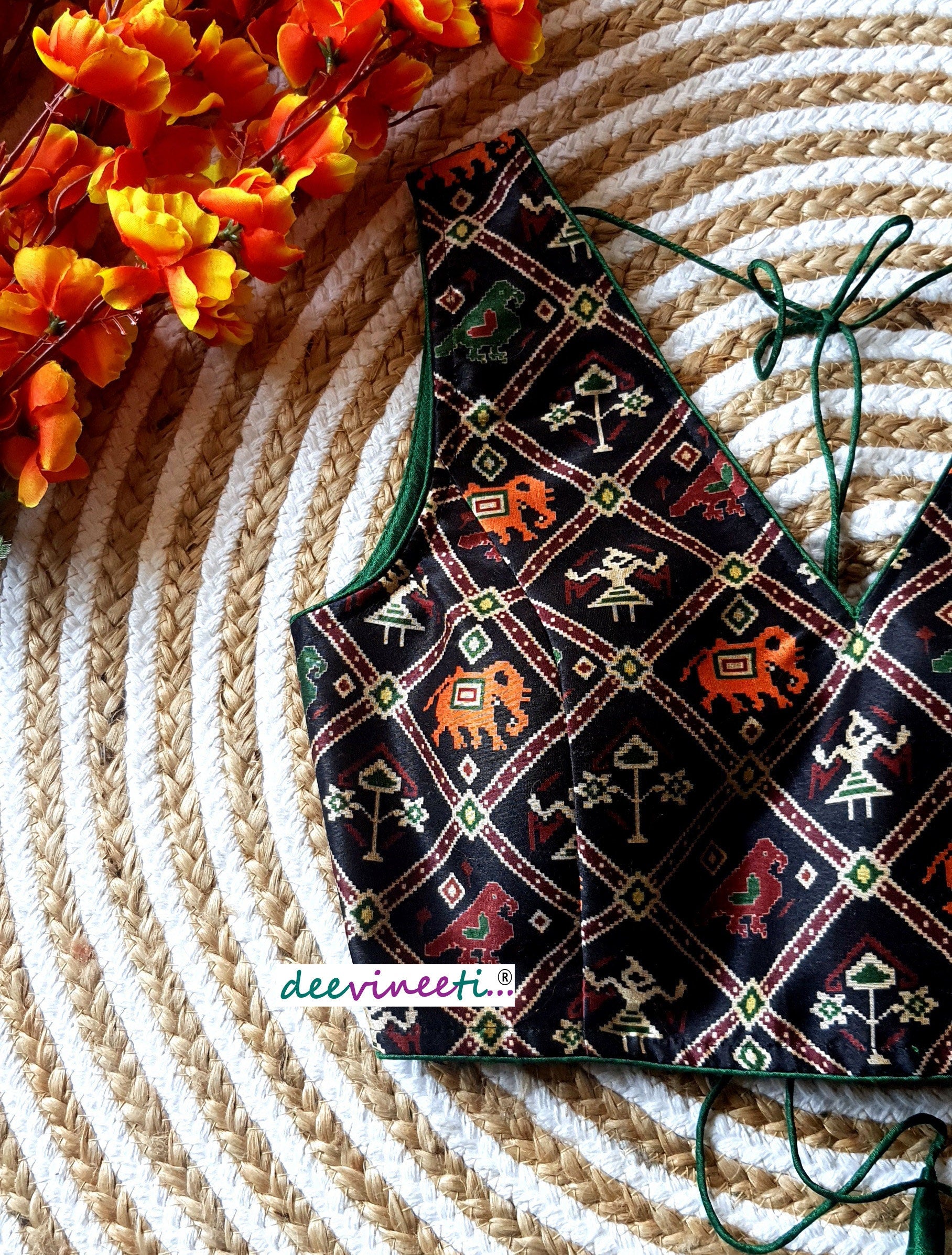 Black Printed Tussar Silk Sleeveless V Neck Blouse. DVBL_095