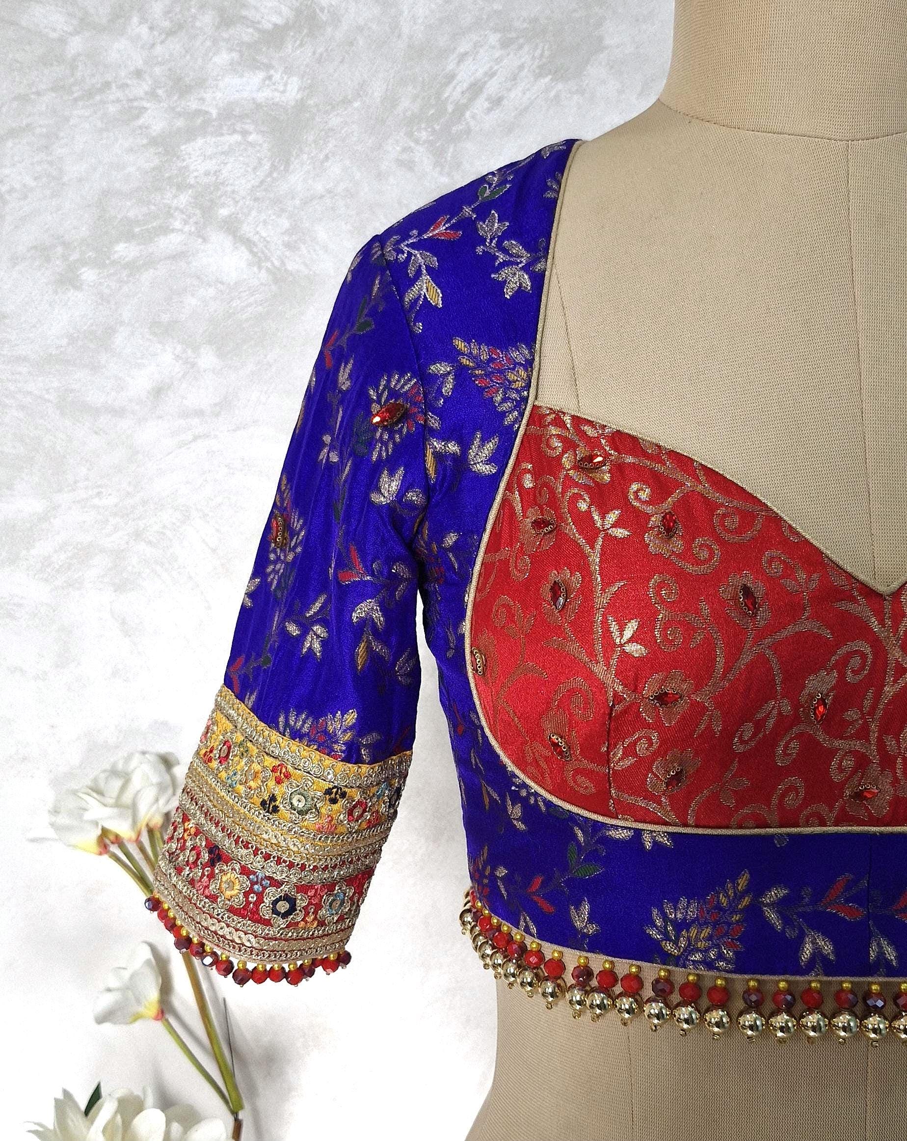 Blue Red Brocade Silk Sweetheart Neckline Blouse DVBL_448