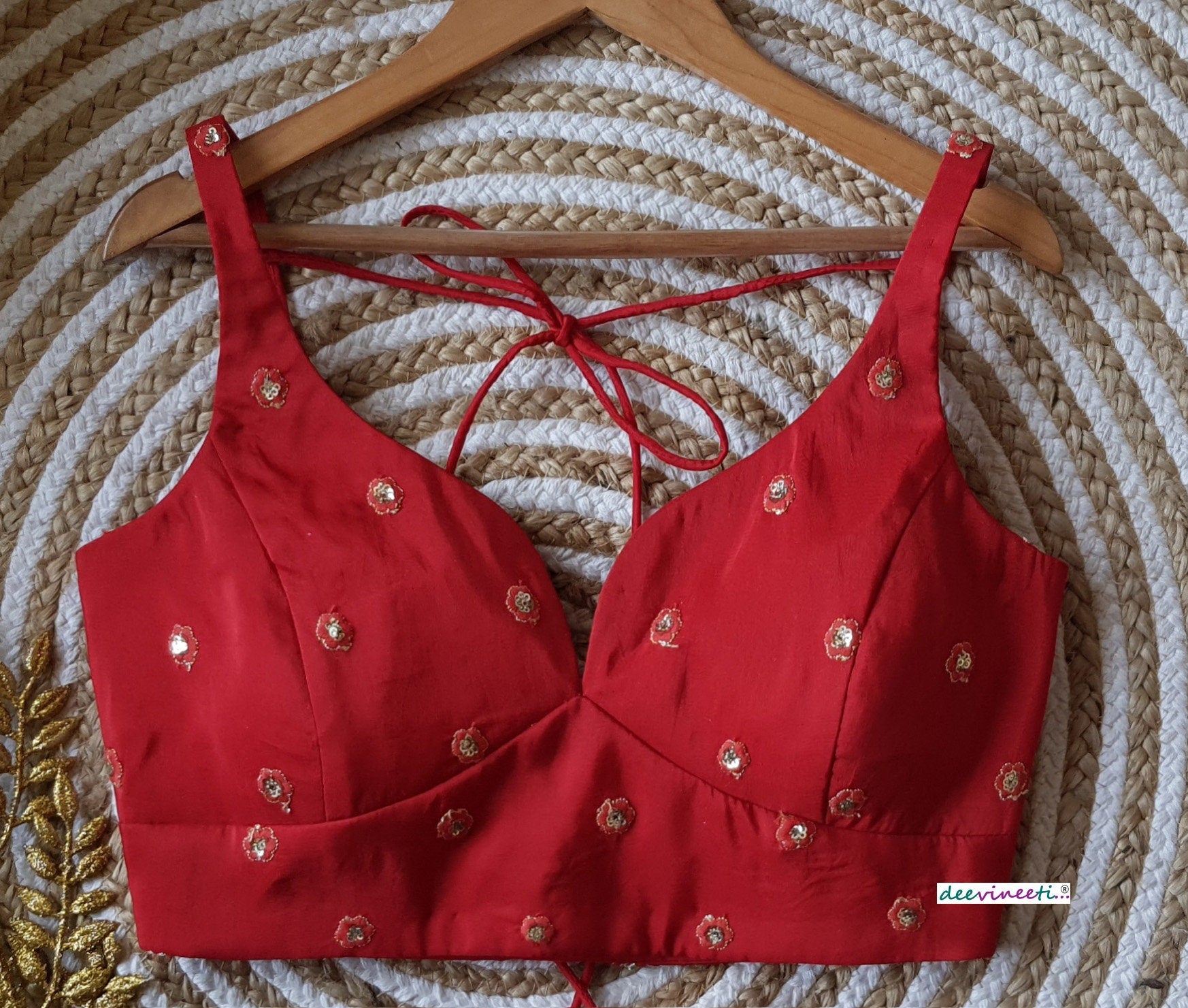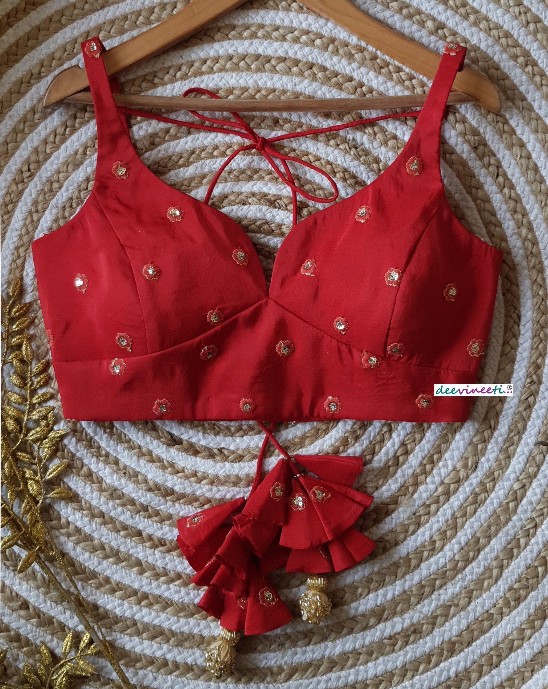 Embroidered Red Silk Deep Sweetheart Neck Blouse DVBL_160