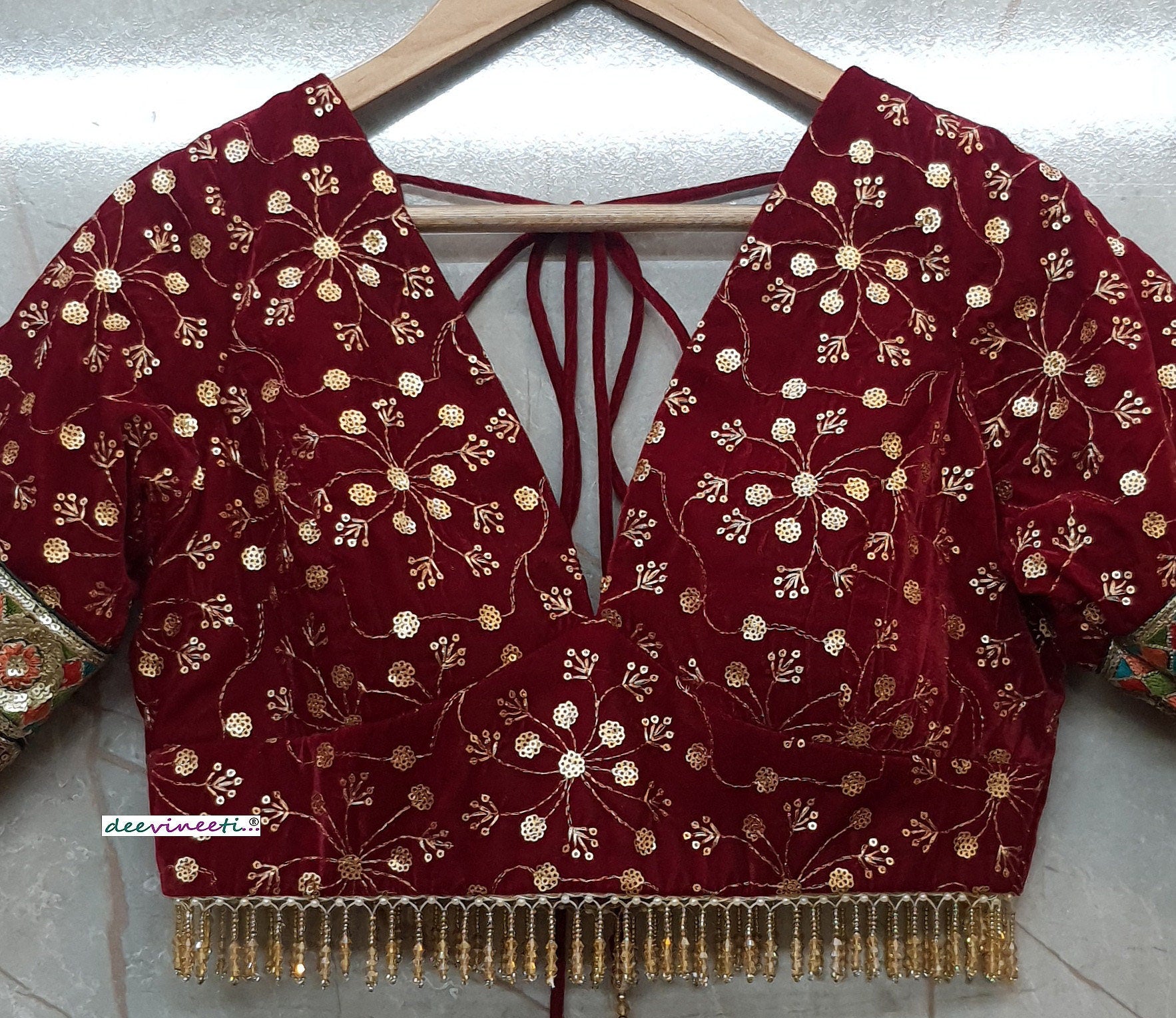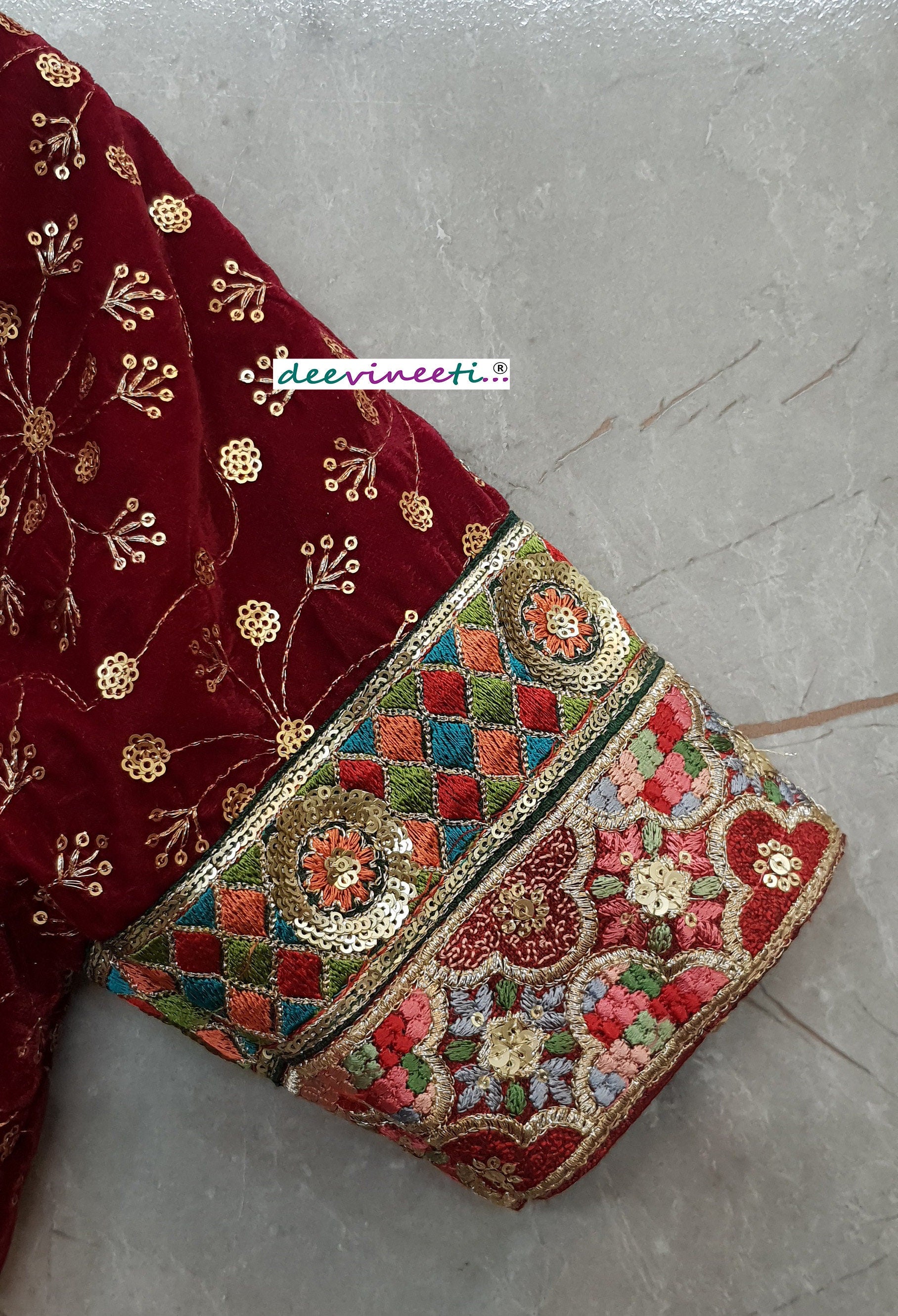 Maroon Embroidered Velvet Deep V Neck Blouse DVBL_200
