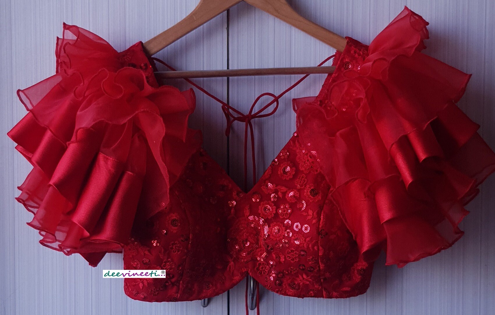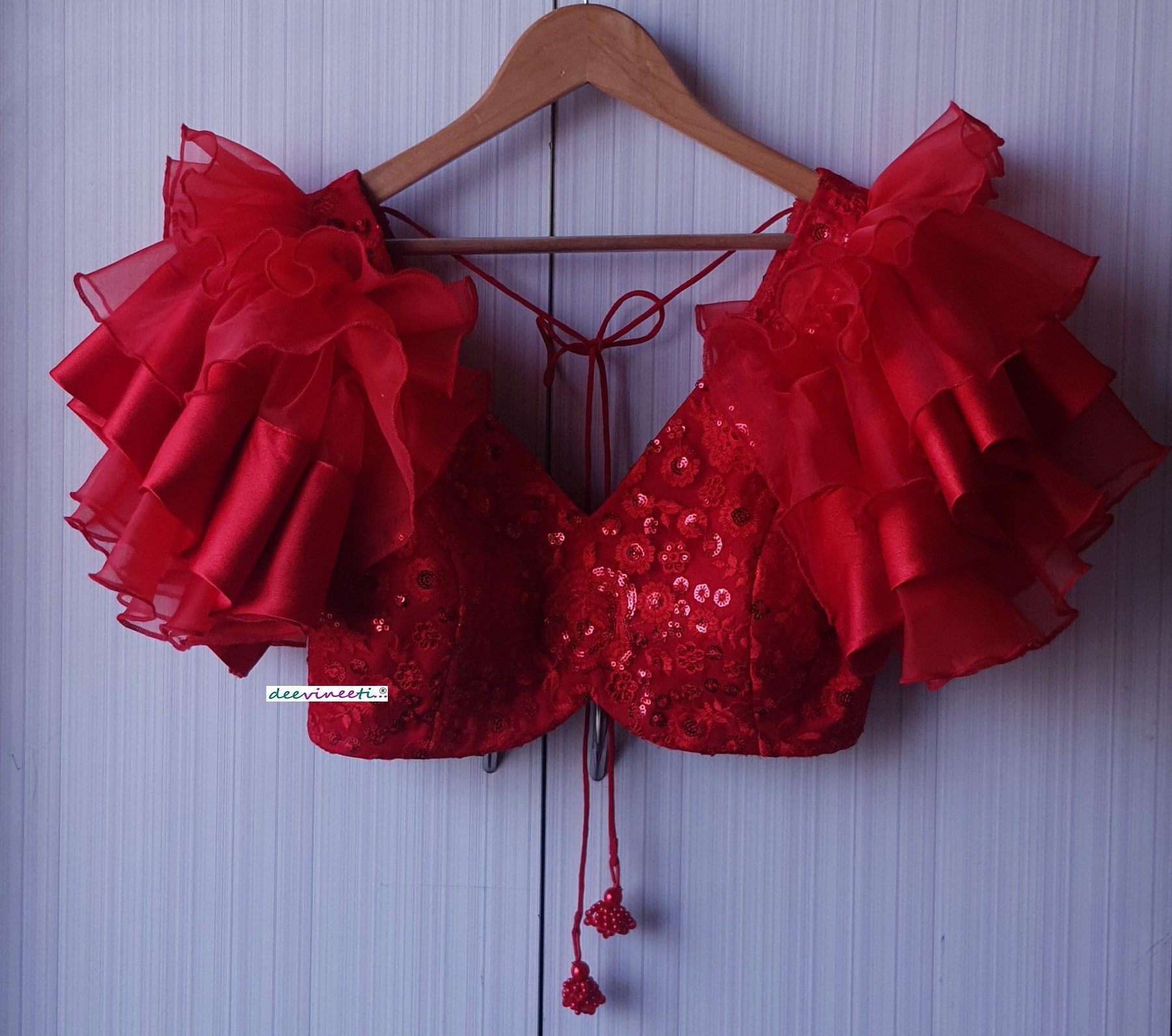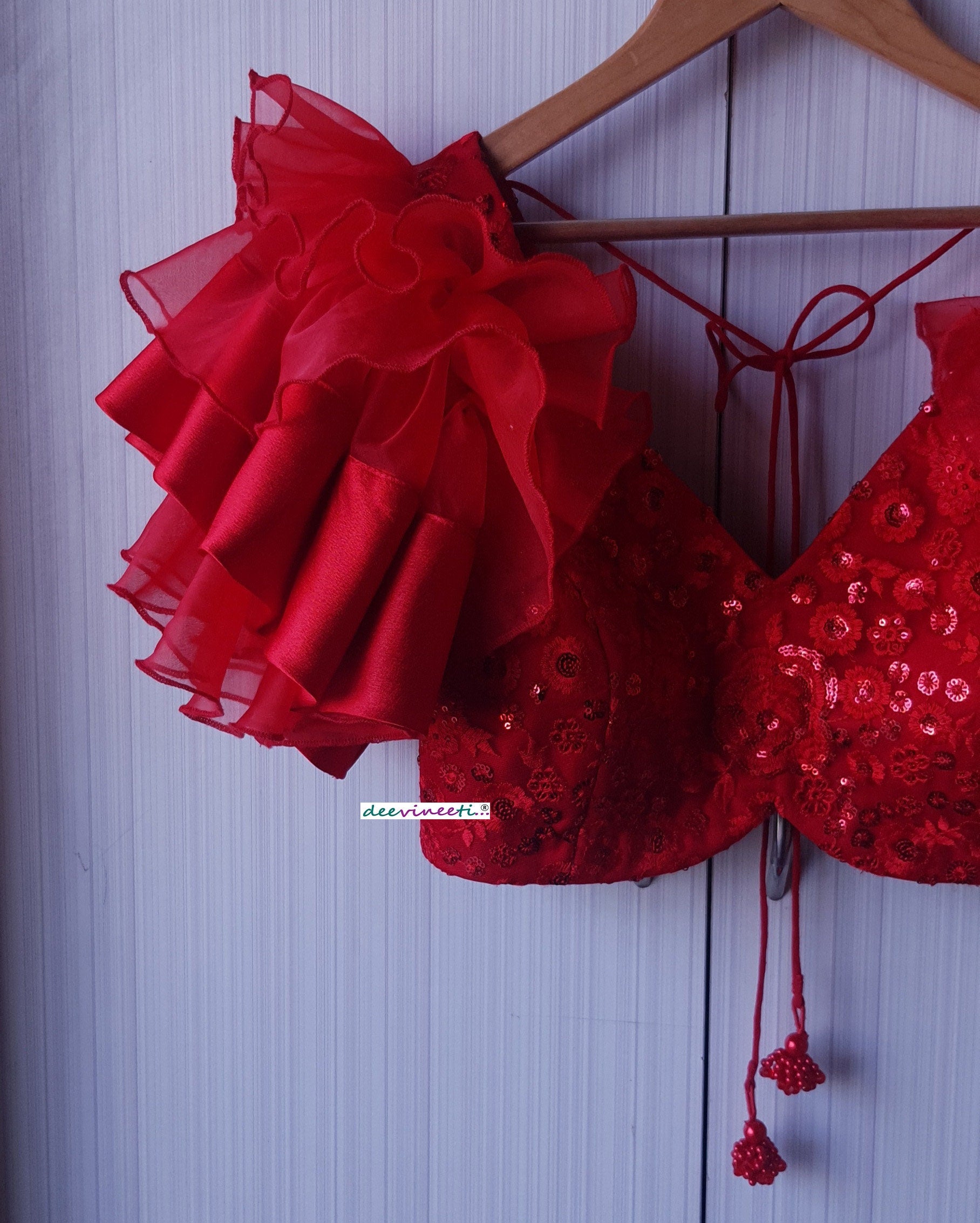 Red Embroidered Deep V Neck Ruffled Sleeves Blouse DVBL_183