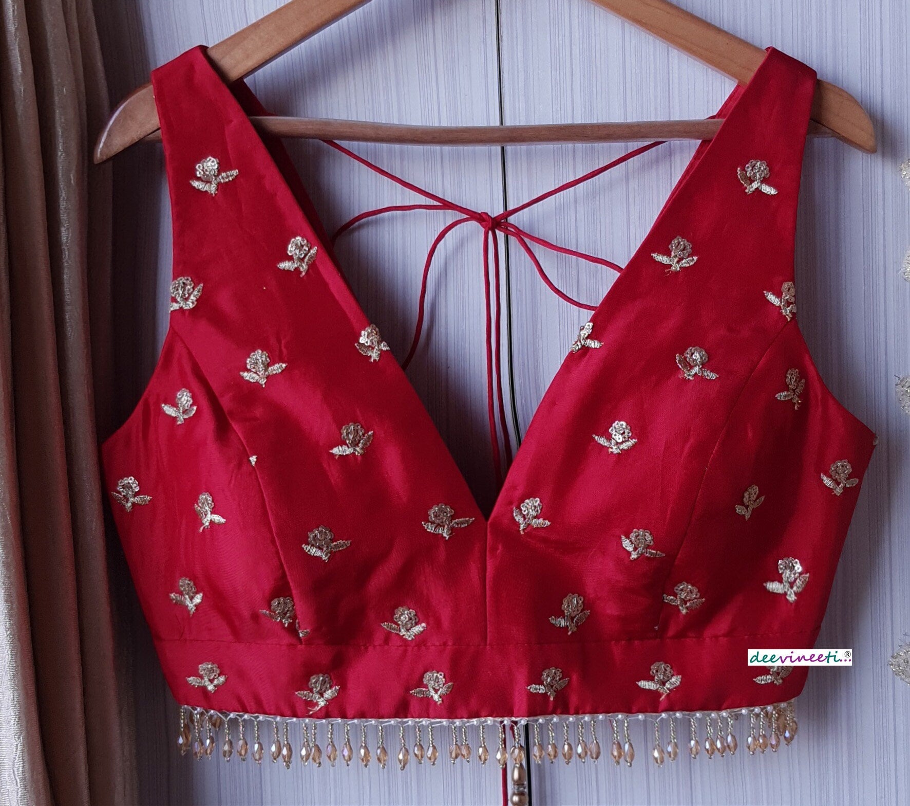 Red Embroidered Upada Silk Deep V Neck Blouse DVBL_170