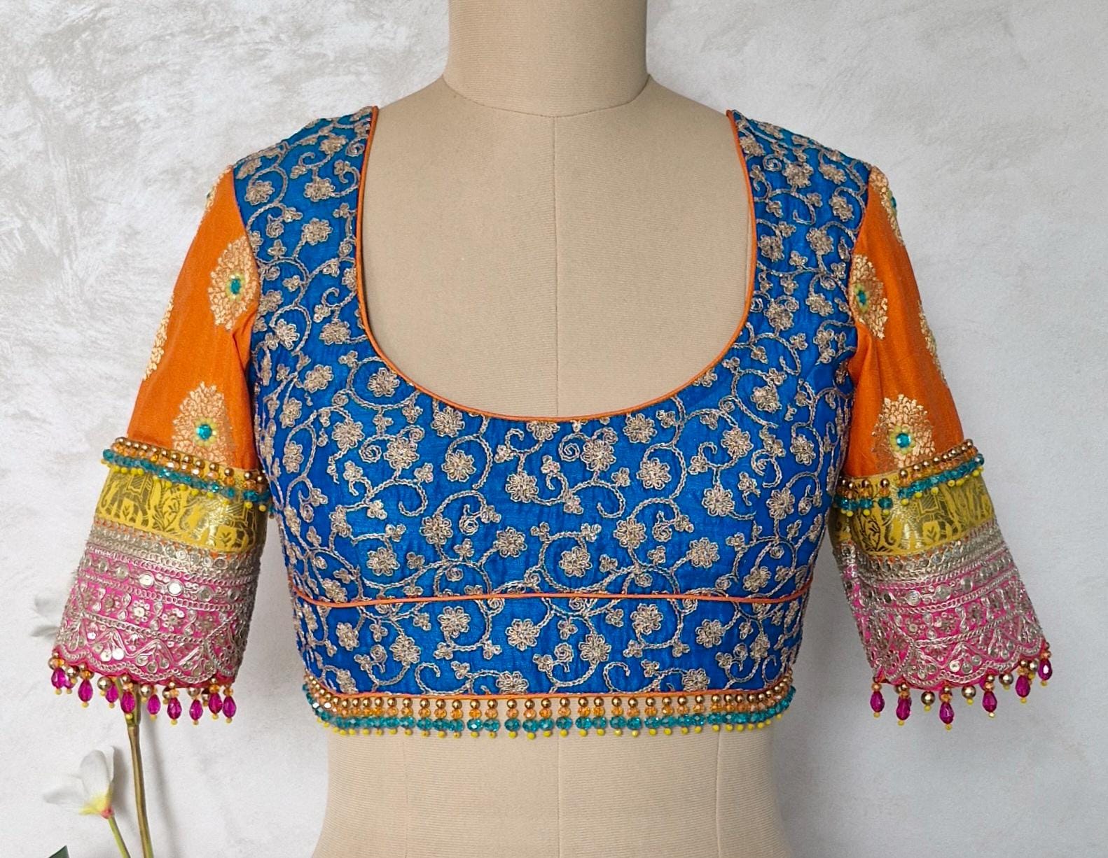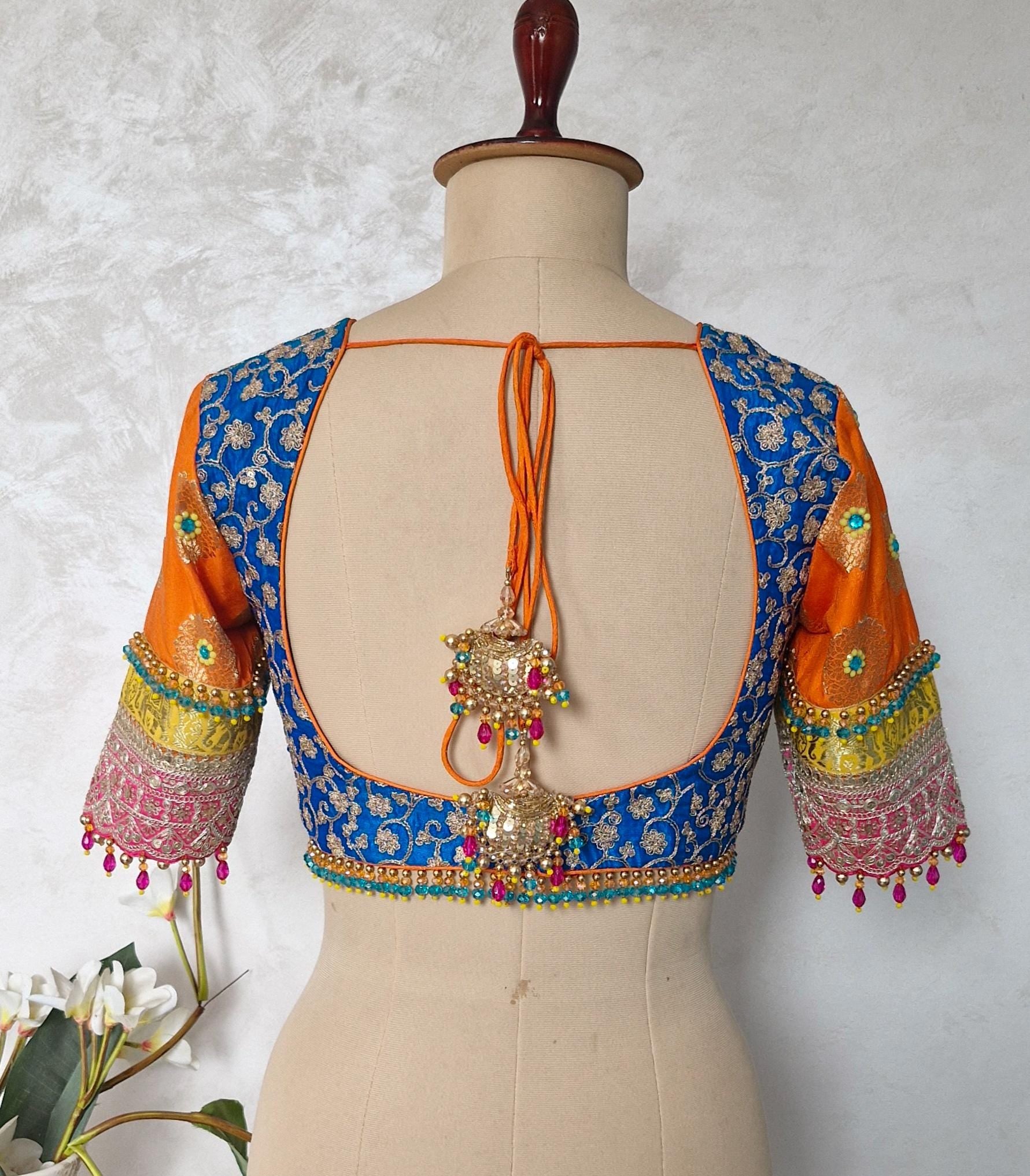 Blue and Orange Embroidered Silk Blouse DVBL_456