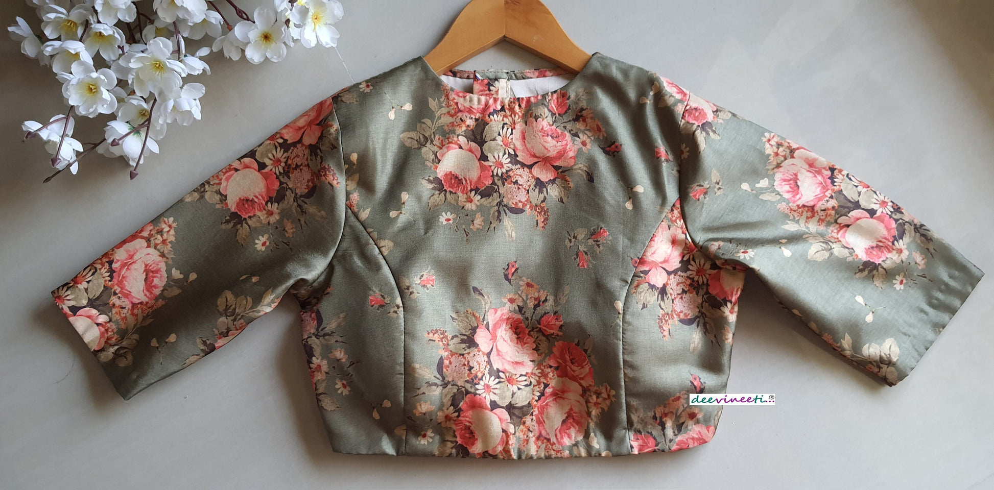 Floral Print Green Khadi Silk Jewel Neck Blouse DVBL_067