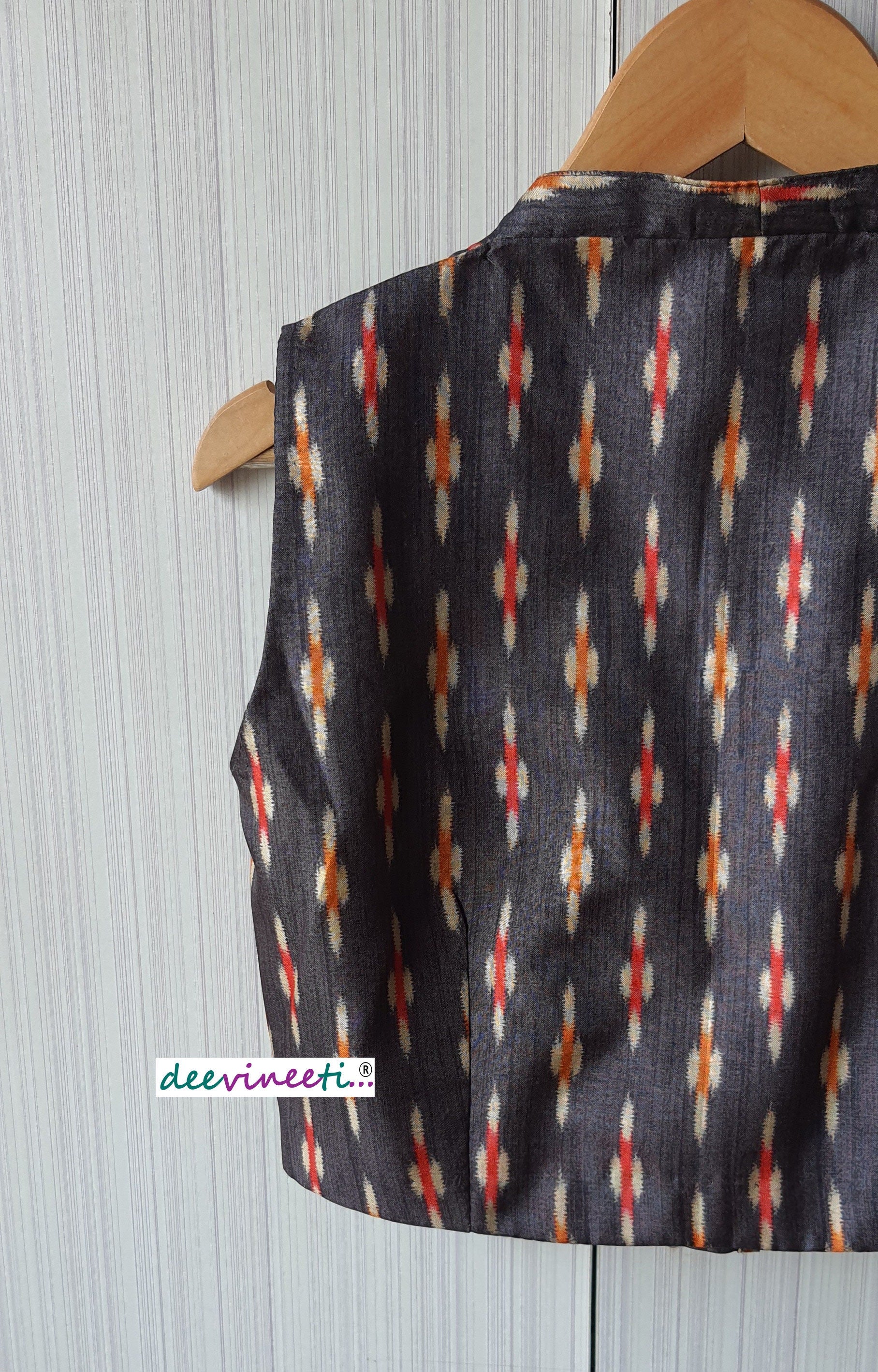Grey Ikat Print Khadi Silk Plunge Neck Blouse DVBL_072