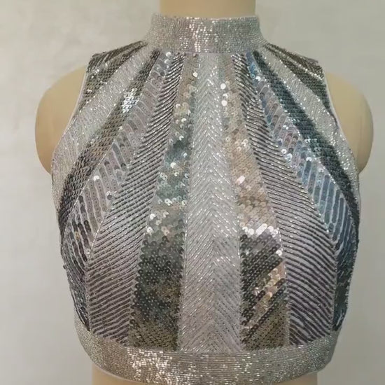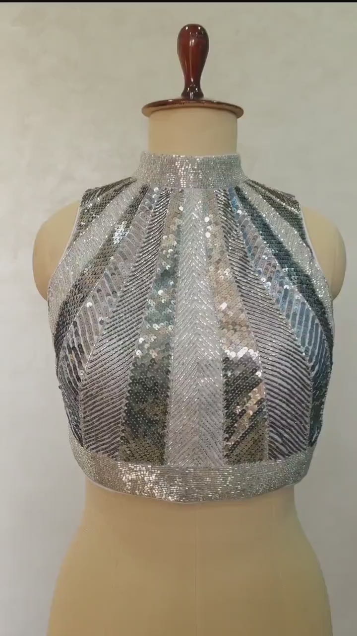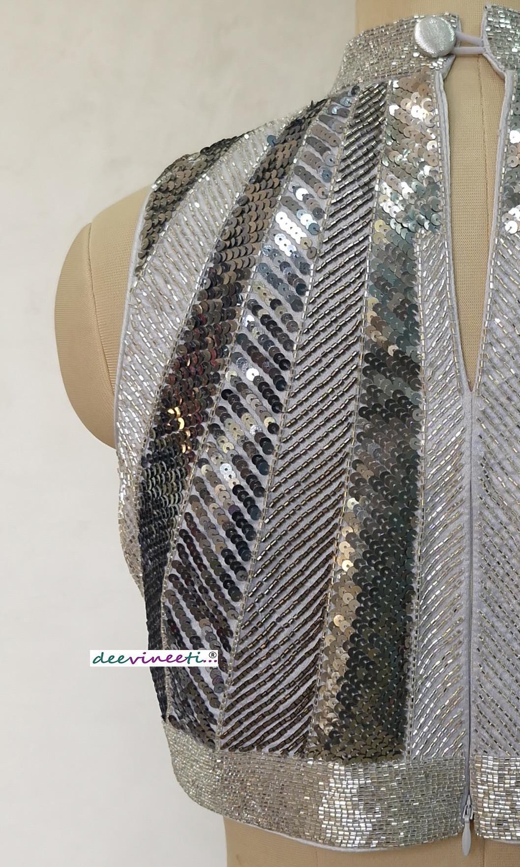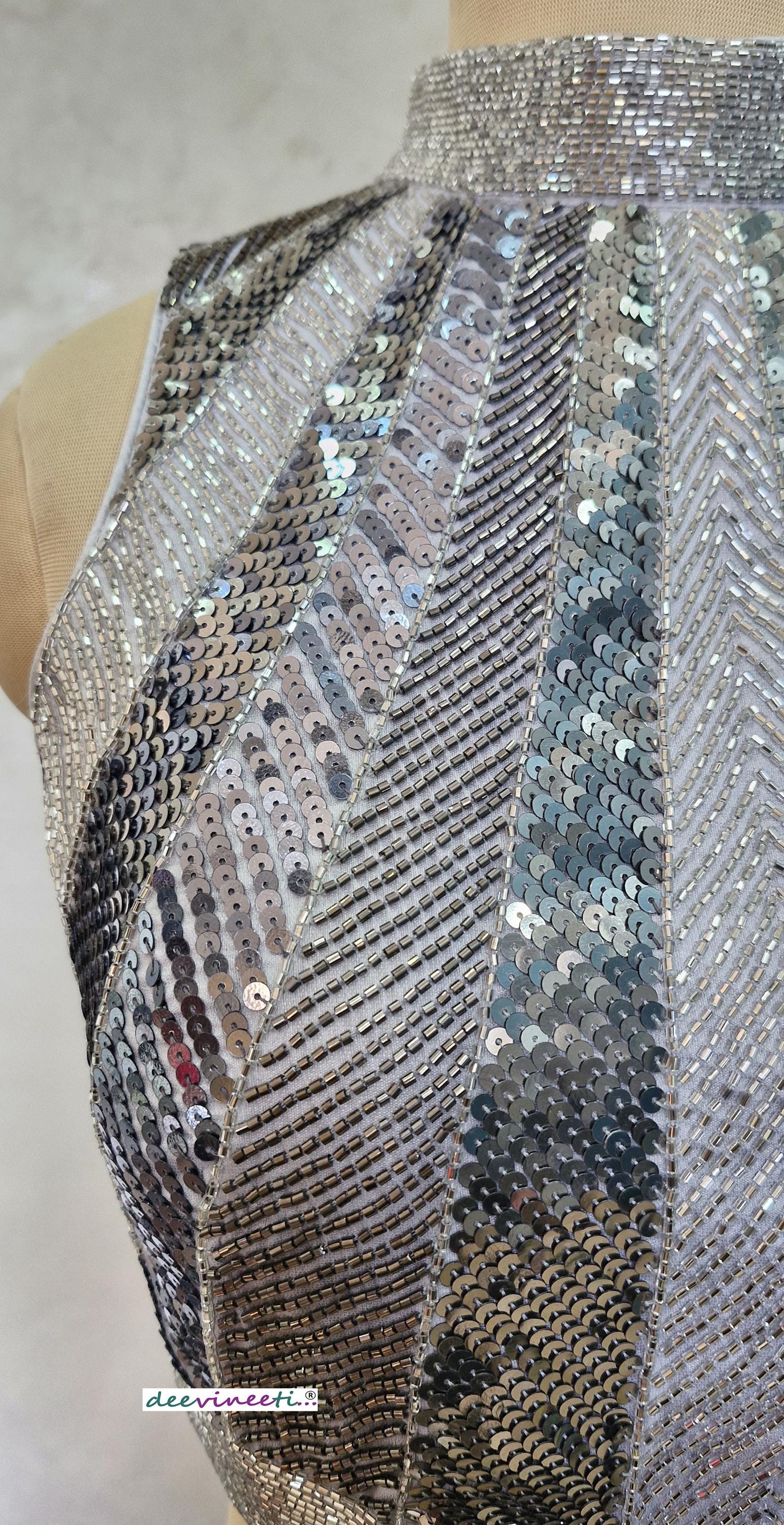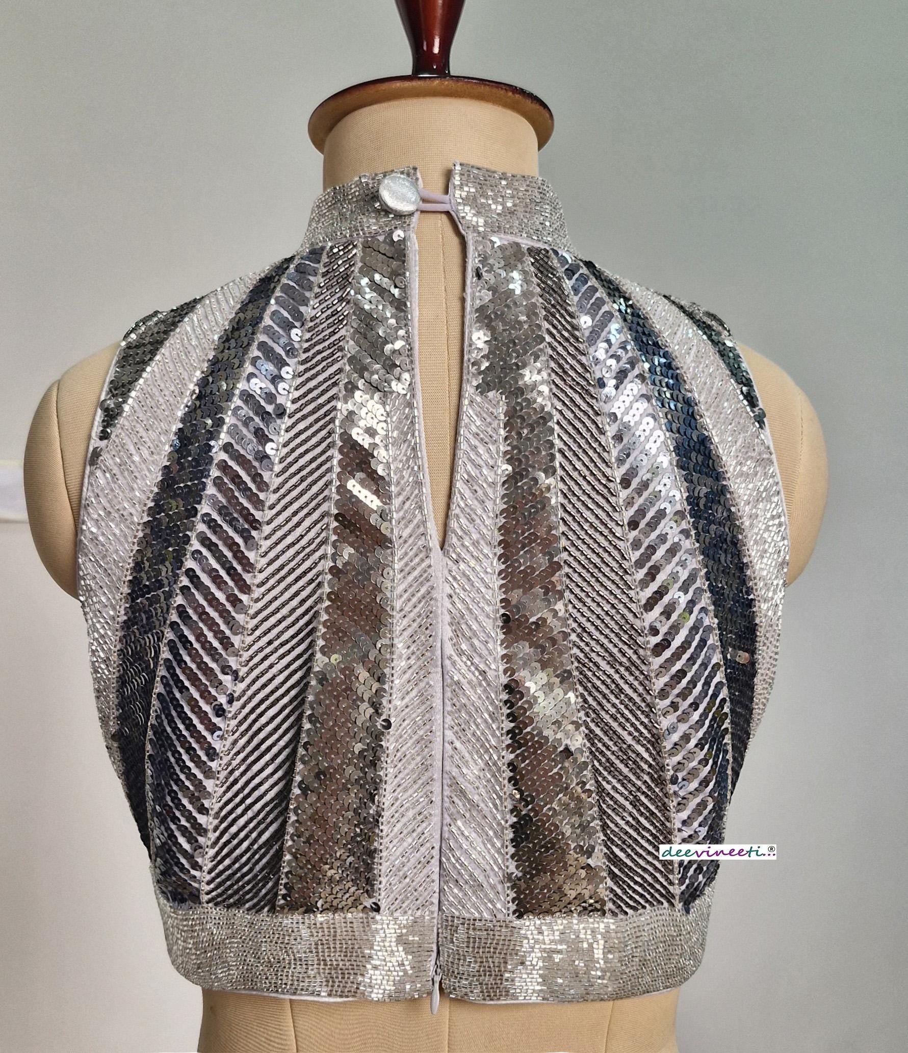 Hand Embroidered Grey Silver Blouse High Neck Sleeveless DVBL_398