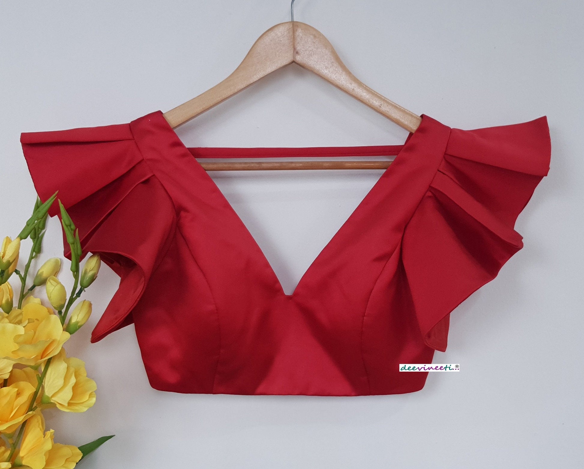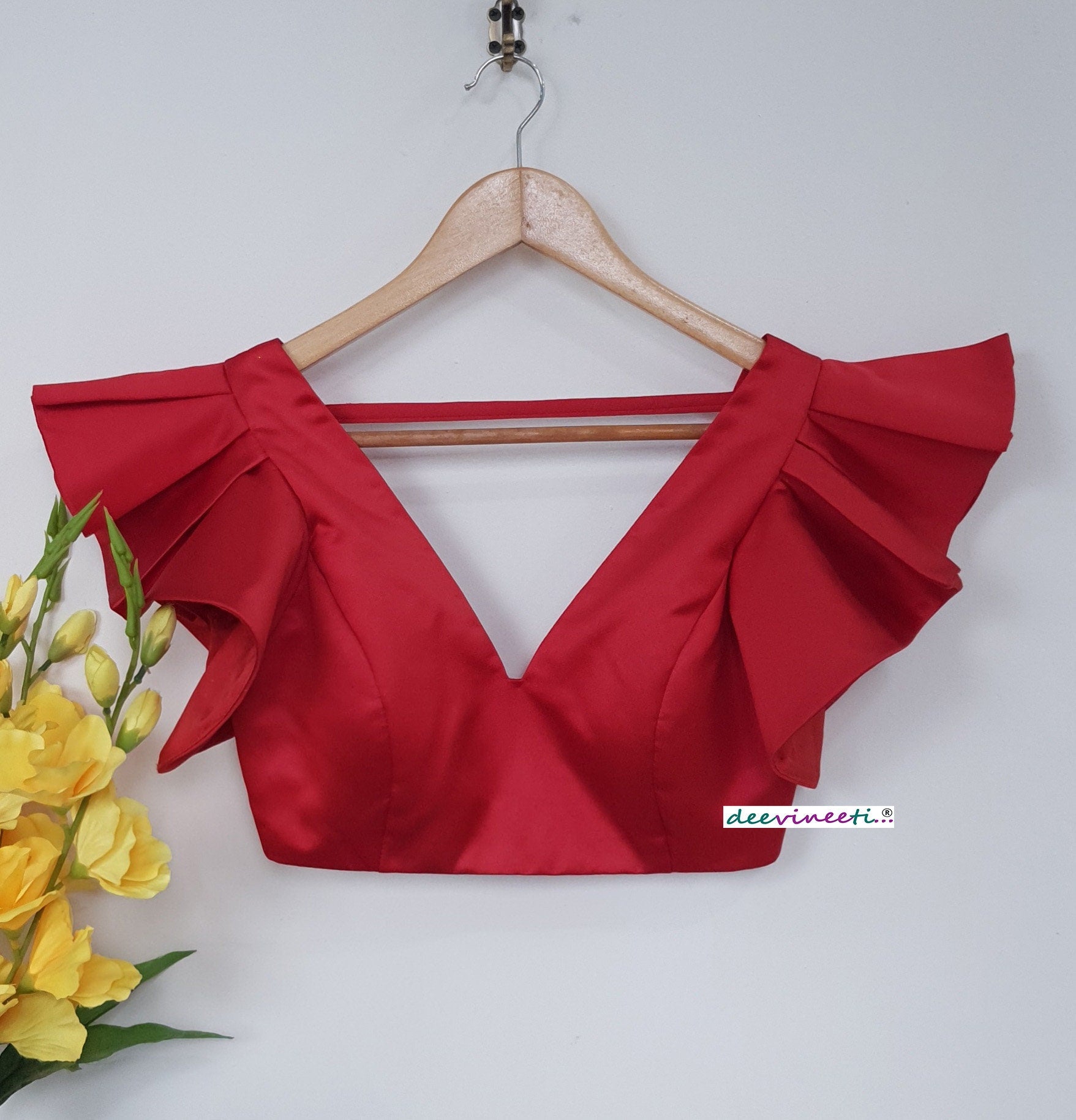 Red Satin Deep V Neck Ruffled Sleeves Blouse DVBL_265