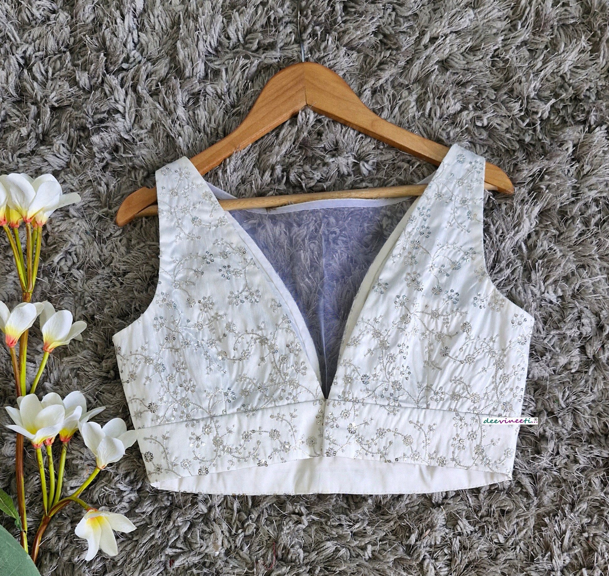 White Embroidered Silk Boat Neck Blouse DVBL_344