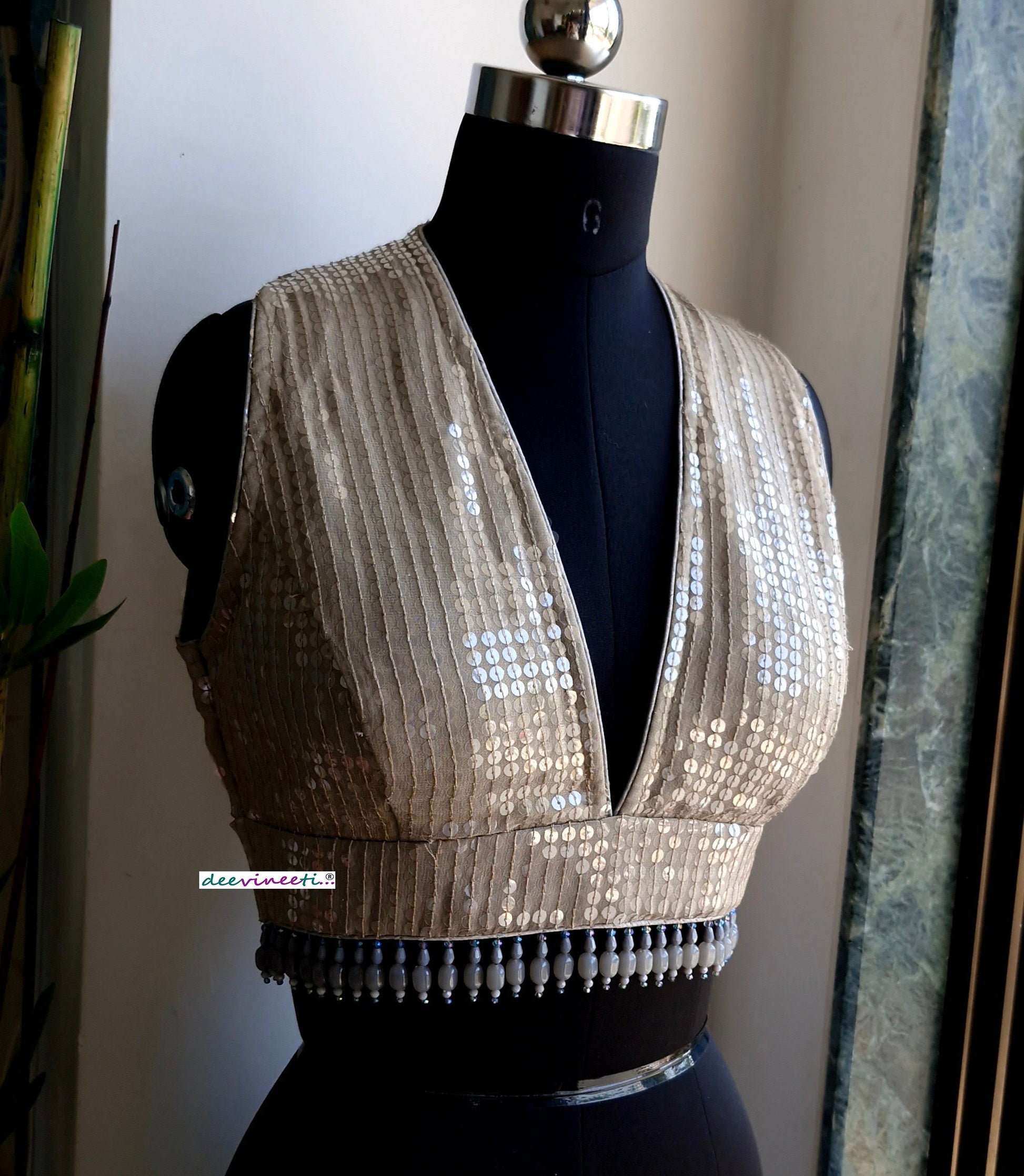Grey Sequins Embroidered V Neck Blouse DVBL_340
