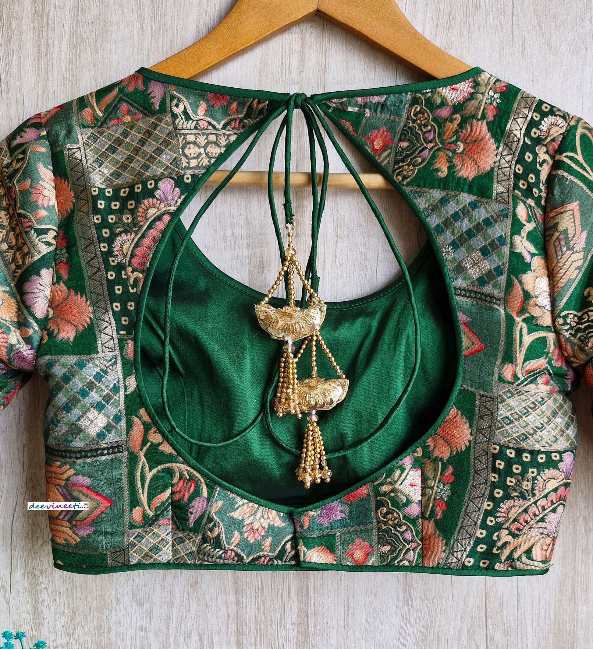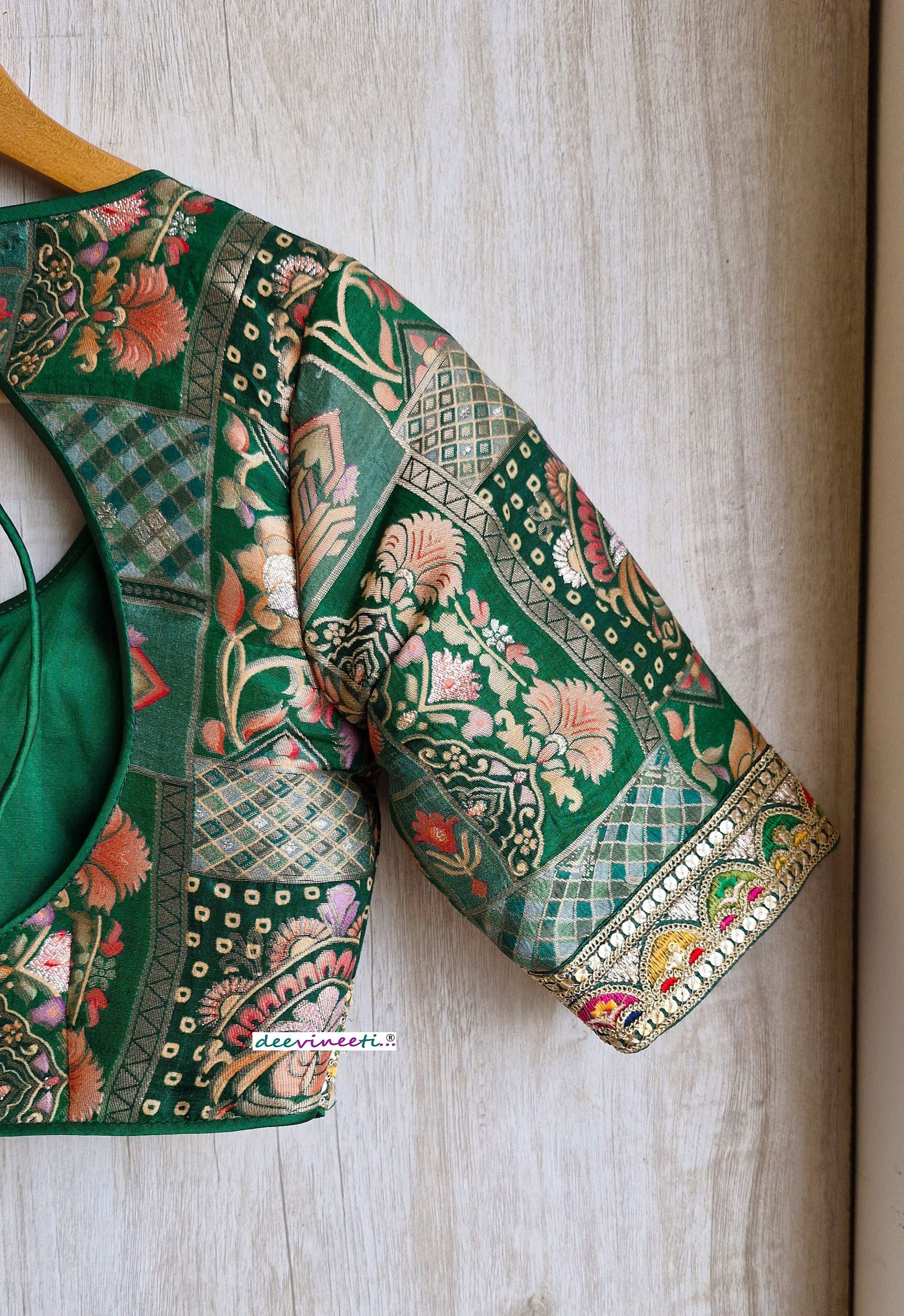 Green Jacquard Silk Round Scoop Neck Blouse DVBL_317