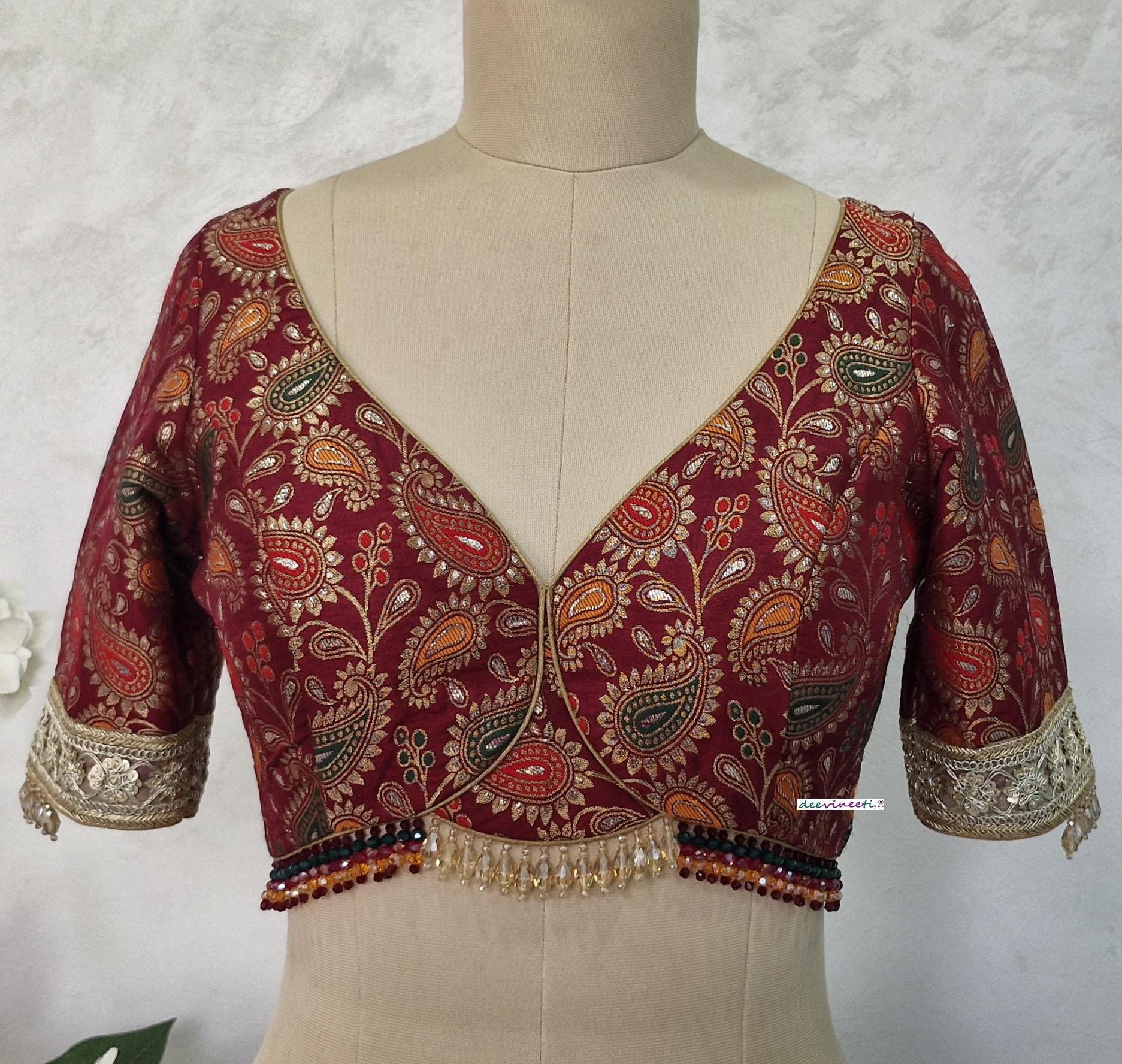 Maroon Brocade Deep Sweetheart Neck Half Sleeves Blouse DVBL_403