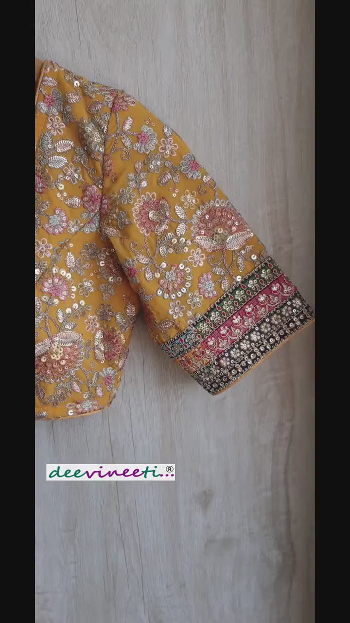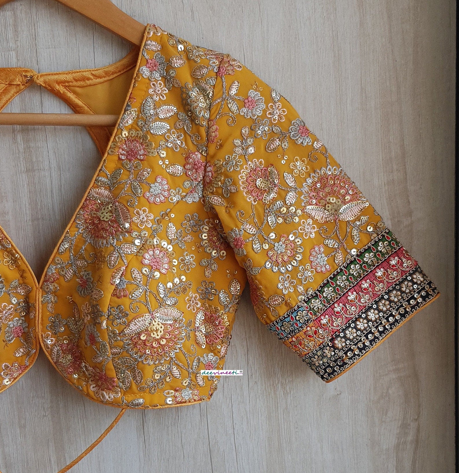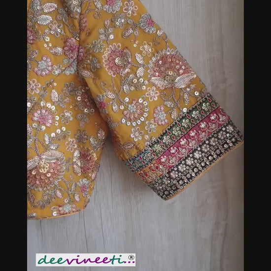 Yellow Embroidered V Neck Elbow Sleeves Blouse DVBL_301