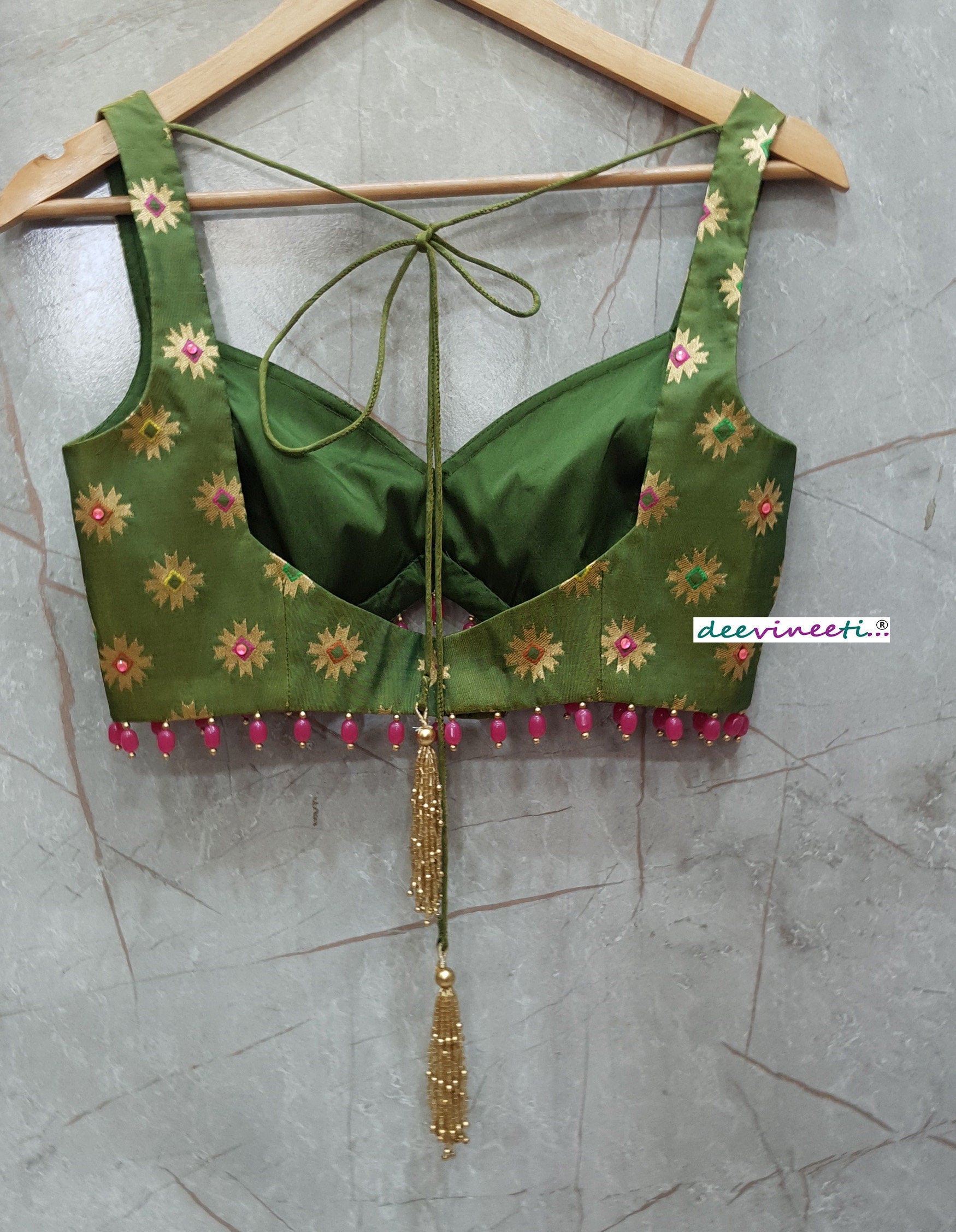 Green Brocade Silk Deep Sweetheart Neck Blouse DVBL_260