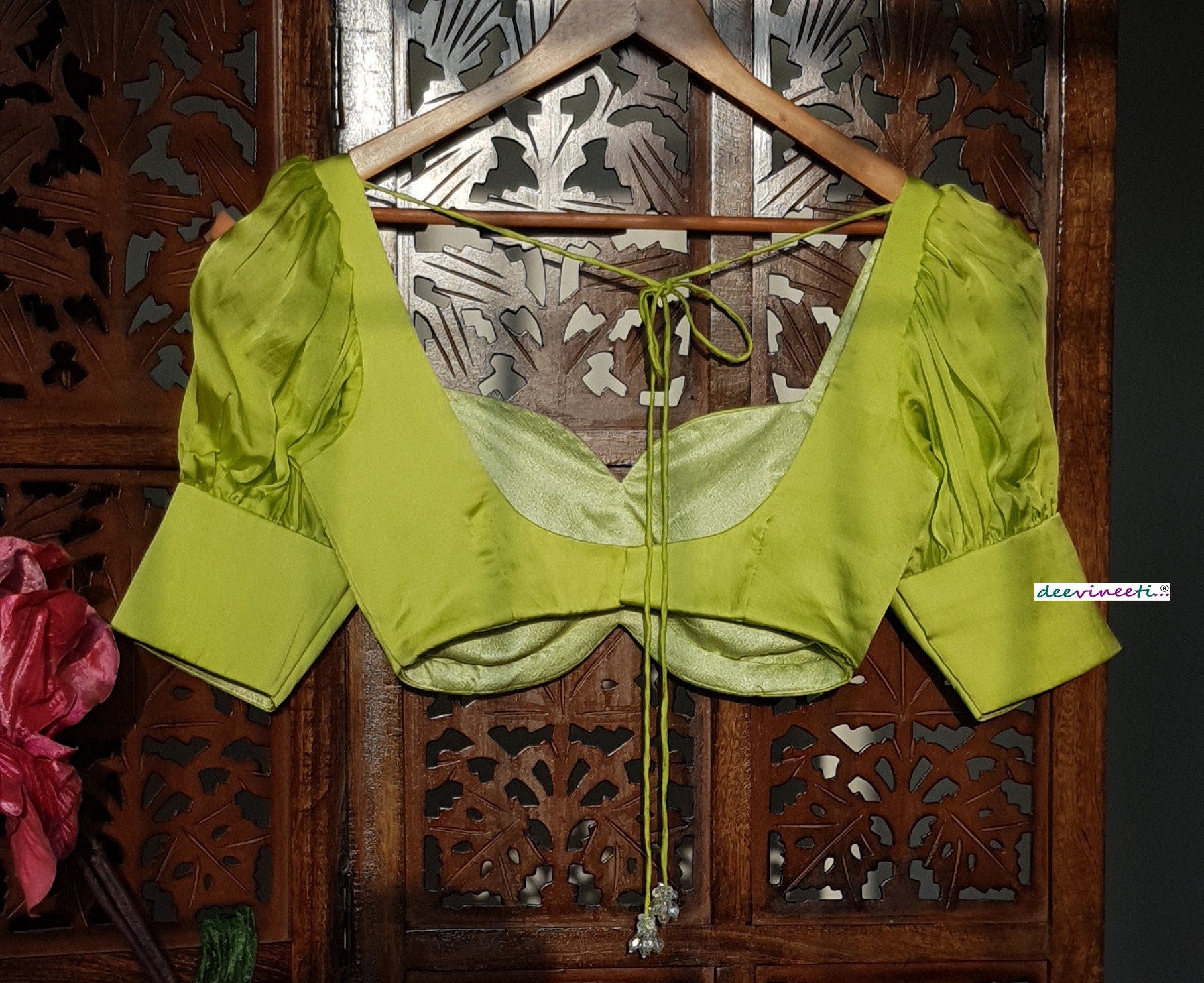 Lime Green Satin Organza Puff Sleeves Blouse DVBL_266