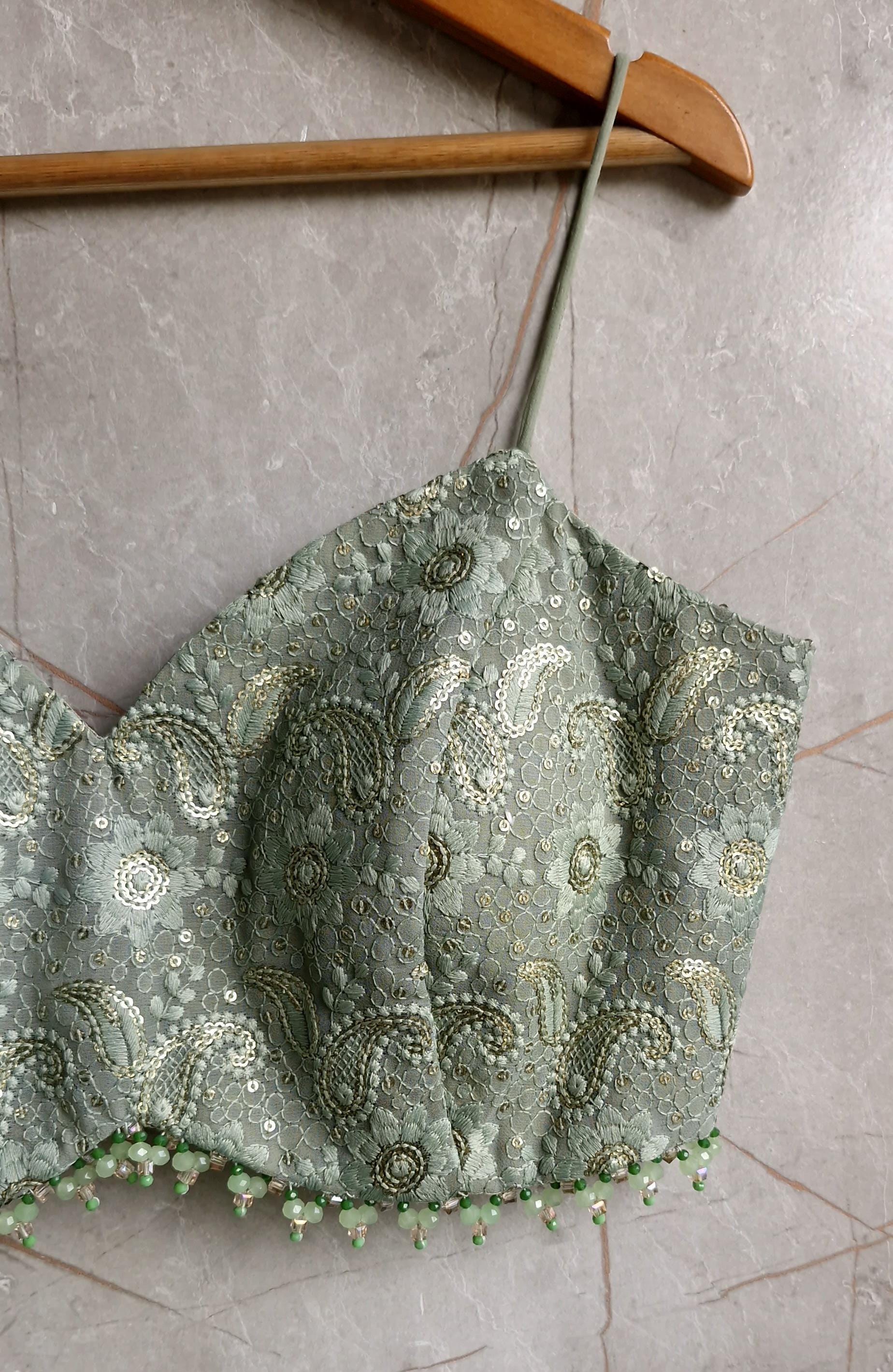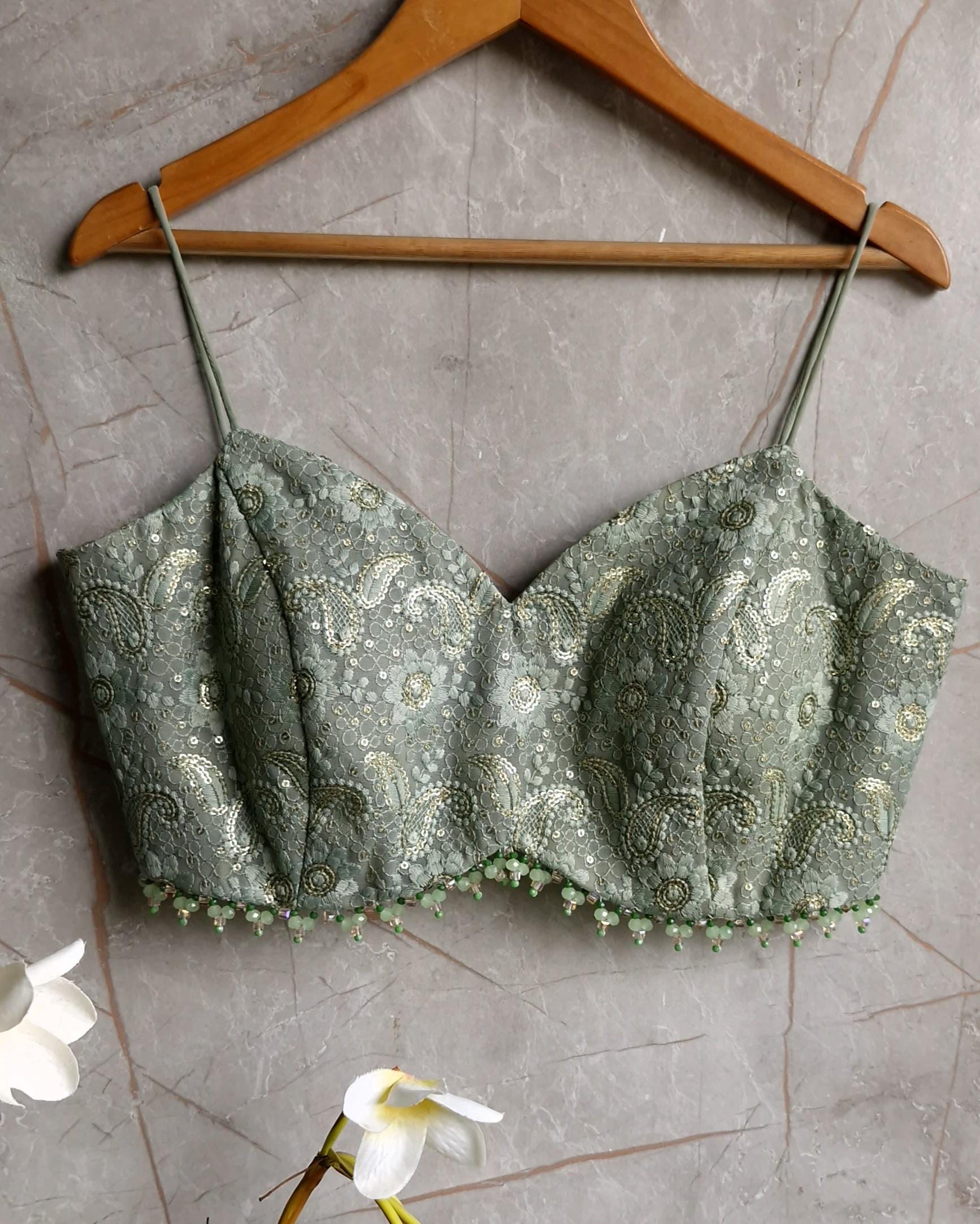 Moss Green Embroidered Georgette V Neck Spaghetti Blouse DVBL_440